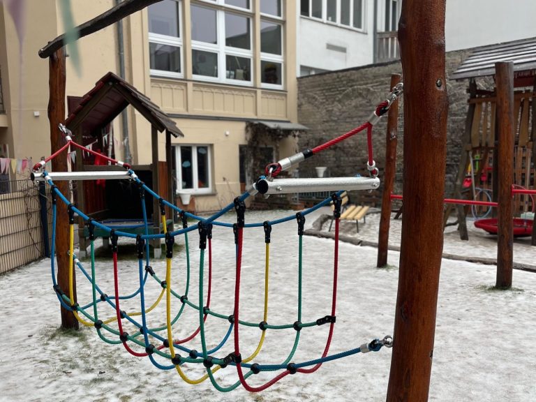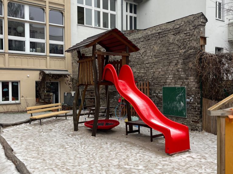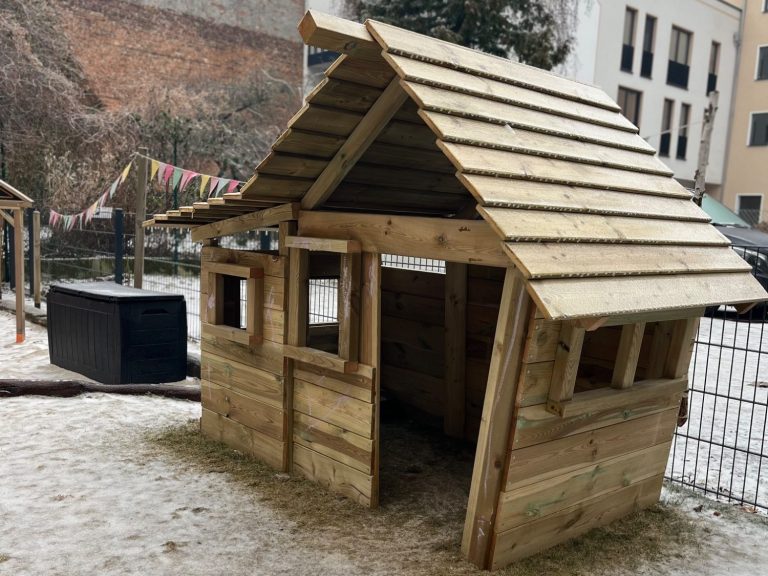 ..lädt die Kinder zum Entdecken und Spielen ein. Hier gibt es einen Rutschenturm, vielfältige Klettermöglichkeiten, ein Spielhaus, sowei eine Matschküche für kreatives Experimentieren Eine kleine Nestschaukel, eine Maltafel mit Kreide, einen Sandkasten und Beete zum Selbstanpflanzen sorgen für viel Abwechslung und Freude im Freien.